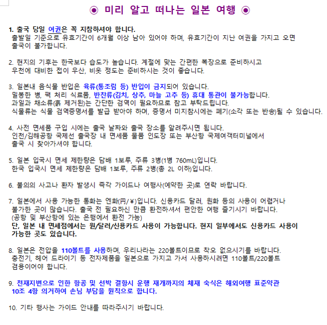 ✅ 기타 개인경비, 국제관광여객세(1인:1,000엔), 기사가이드봉사료(1인:20,000원)